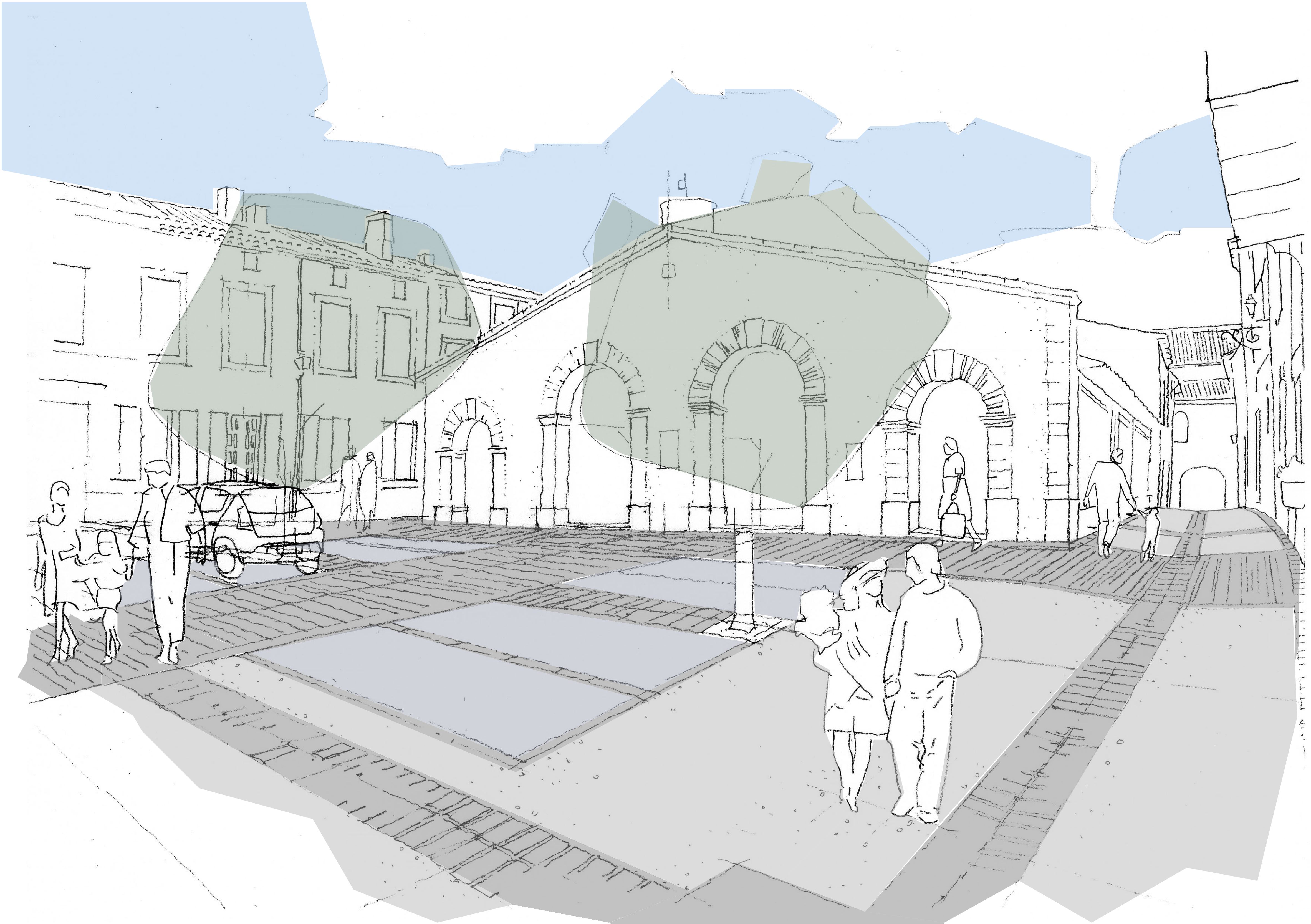 L’essence de notre démarche est de repenser l’espace public, imprégné d’histoire, selon une facture et un fonctionnement contemporain. C’est par le choix des revêtements de sol que l’on va trouver cette justesse entre un cadre bâti, révéler des ambiances, figurer l’incessante fuite des lumières et des ombres, être complice de la pratique des lieux. À quoi tient la beauté des centres bourgs? À toute une serie de détails qu’il s’agit de souligner. Ici des lignes de briques entre les pavés de pierre, ou plus intéressant inclues dans le béton désactivé. .
