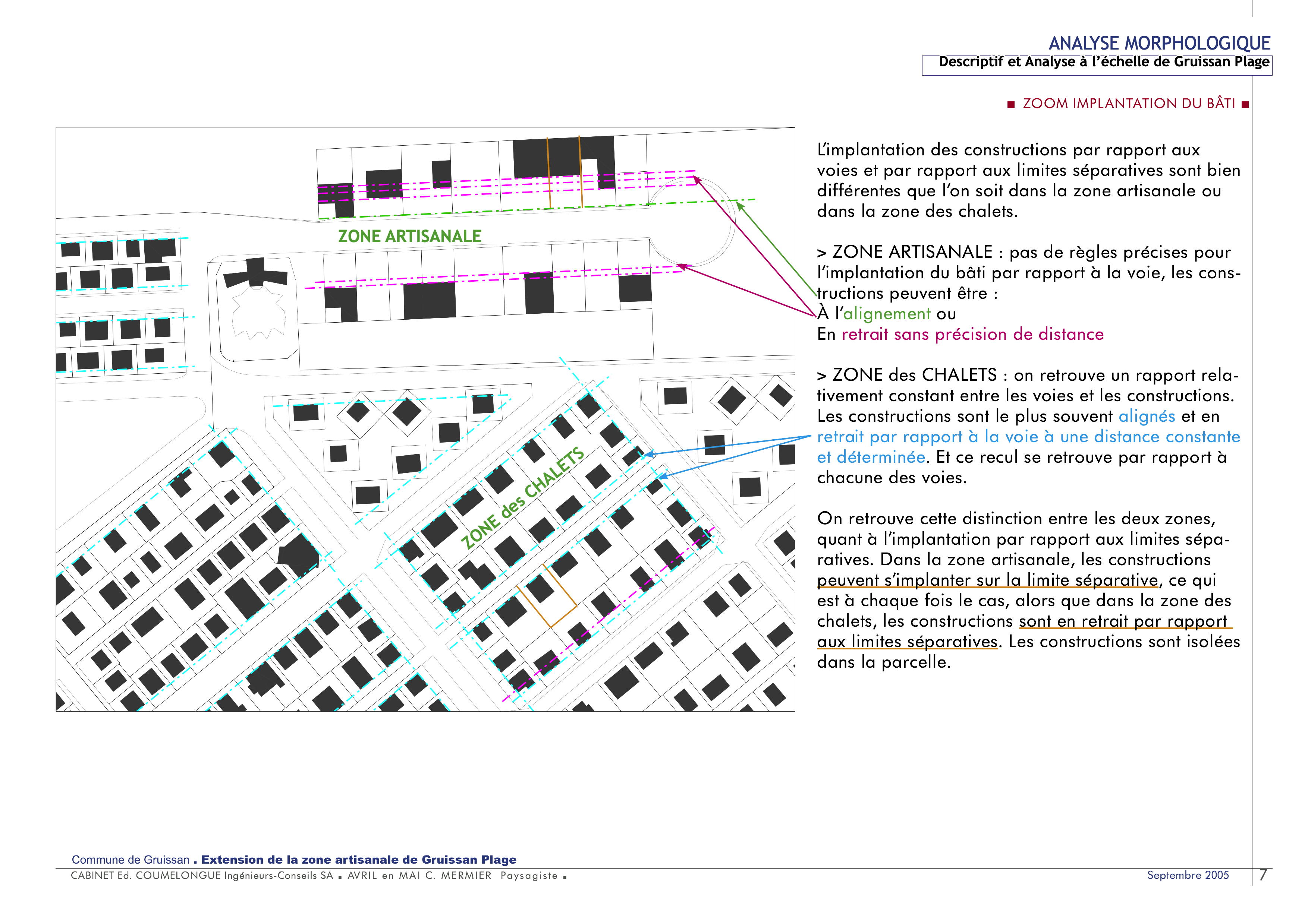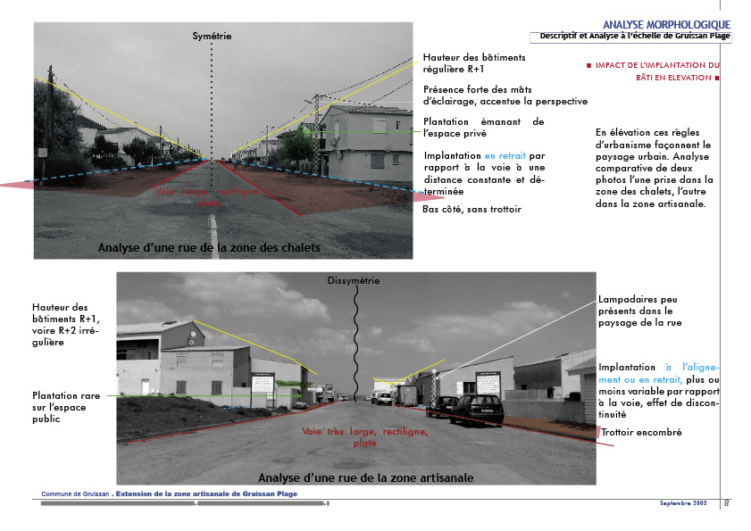 - la présence du végétal… Mise en exergue des éléments du paysage urbain de Gruissan-Plage en analysant des photos. L’ensemble de ces données nous a permis d’élaborer des principes à respecter pour la future extension. Ces principes ont été transcrits dans les textes réglementaires (PLU) mais également dans une charte signée entre la communauté de commune, la commune et les artisans, et dans la réalisation de l’extension.